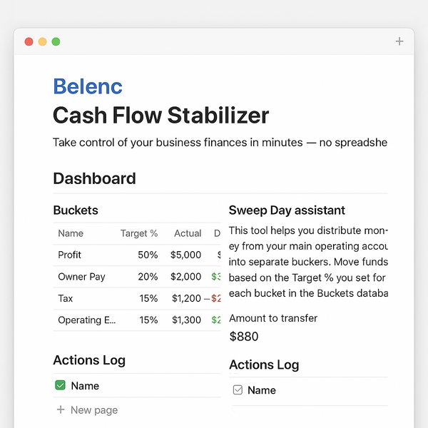 Belenc Cash Flow Stabilizer is a Notion cash‑flow hub with a weekly Health Score, Profit‑First buckets, and guided actions in under 5 minutes.